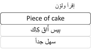 فقط أنظر لهذا المثال Piece of cake ثم، اقرأ المعنى بالعربي Piece of cake – سهل جداً الان، اقرأ اللفظ بالعربي . Piece of cake – بِيس أُاڨ كِاِك لِتسمع نُطق ولفظ جملة الإنجليزي، ظللها، ثم اضغط على زر السماعة Piece of cake – بِيس أُاڨ كِاِك – سهل جداً Categories: Common Idioms (أمثال شعبية)