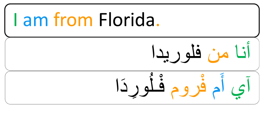 I am from Florida I am from Florida. أنا من فلوريدا آي أَم فْروم فْـلُورِدَا Continue reading Categories: Introductions (تعارف وتقديم النفس)