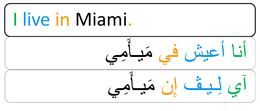 I live in Miami. I live in Miami. أنا أعيش في ميامي آي لِـيـڤ إِن مَيـأَمِي Continue reading Categories: Introductions (تعارف وتقديم النفس)