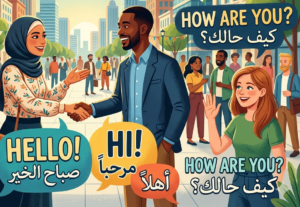 Greeting (تحية)Pronunciation (نطق)Response (الرد)Pronunciation (النطق)Arabic (المعنى)