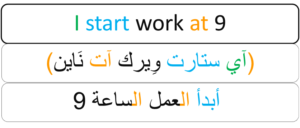 I start work at 9 — (آي ستارت وِيرك آت نَاين) — أبدأ العمل الساعة 9