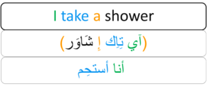 I take a shower — (آي تِاِك إِ شَاوَر) — أنا أستحِم